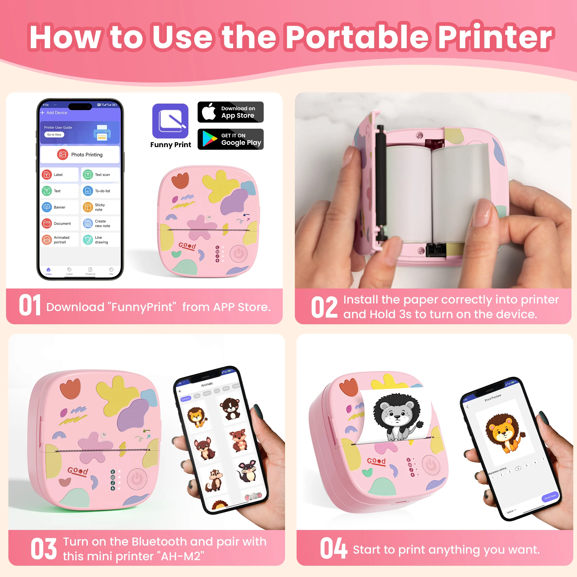 【Easy Bluetooth Setup & Smart App Control】Print anytime, anywhere — just connect your smartphone via Bluetooth. Compatible with both iOS & Android: 1.Download the “FunnyPrint” app. 2.Long press the power button until the light flashes. 3.Connect to “AH-M2” via Bluetooth and start printing! The app includes handy features like drag & zoom, OCR, templates, text tools, and fun stickers to unleash your creativity