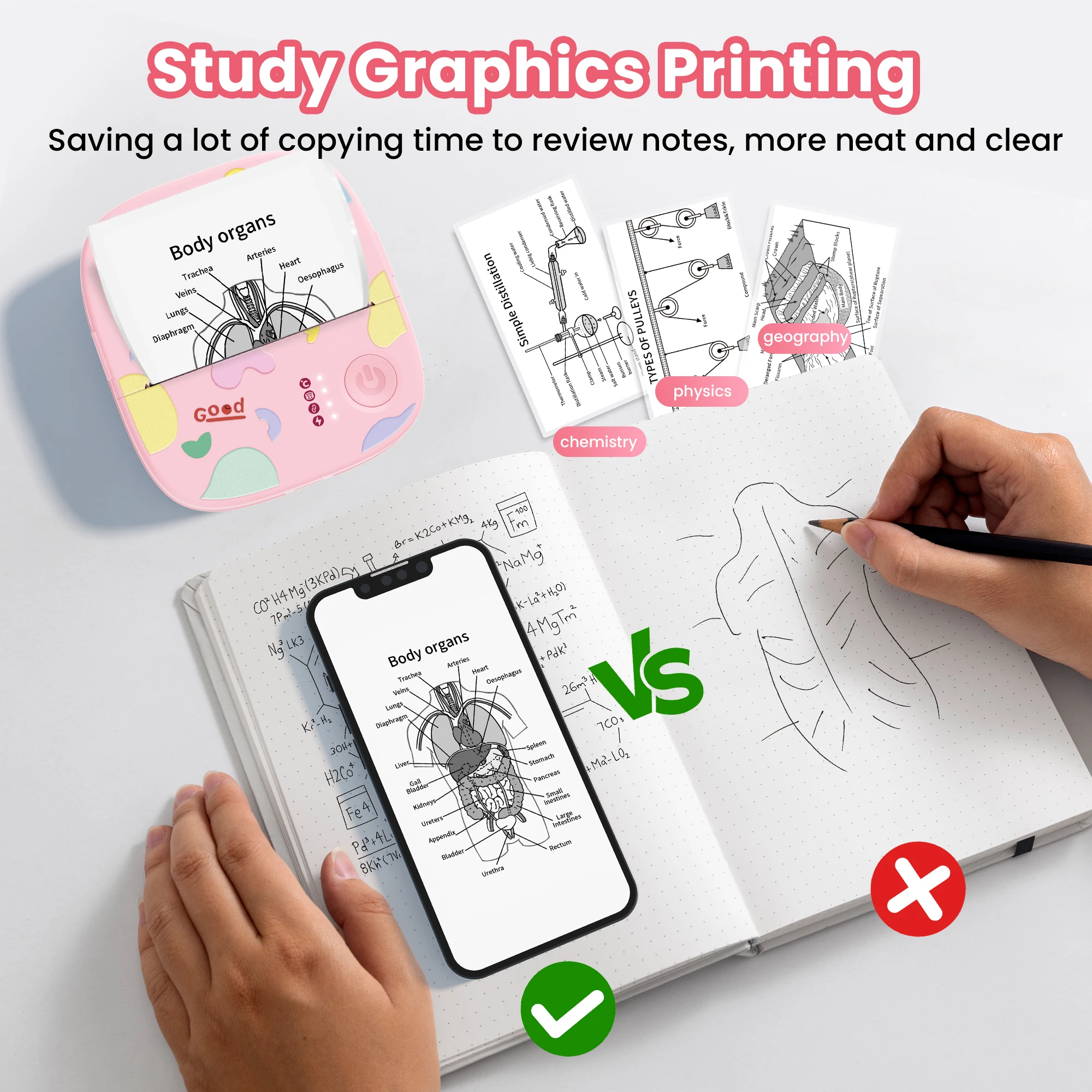 【All-in-One Mini Sticker Printer for Life & Work】Meet your all-purpose printing companion — Mini portable printer. Whether you're organizing your to-do list, printing study notes, decorating journals, crafting DIY cards, or capturing memories photos, this pocket-sized powerhouse has you covered. Comes with a built-in sawtooth for smooth, clean tearing — just tear straight for the best result