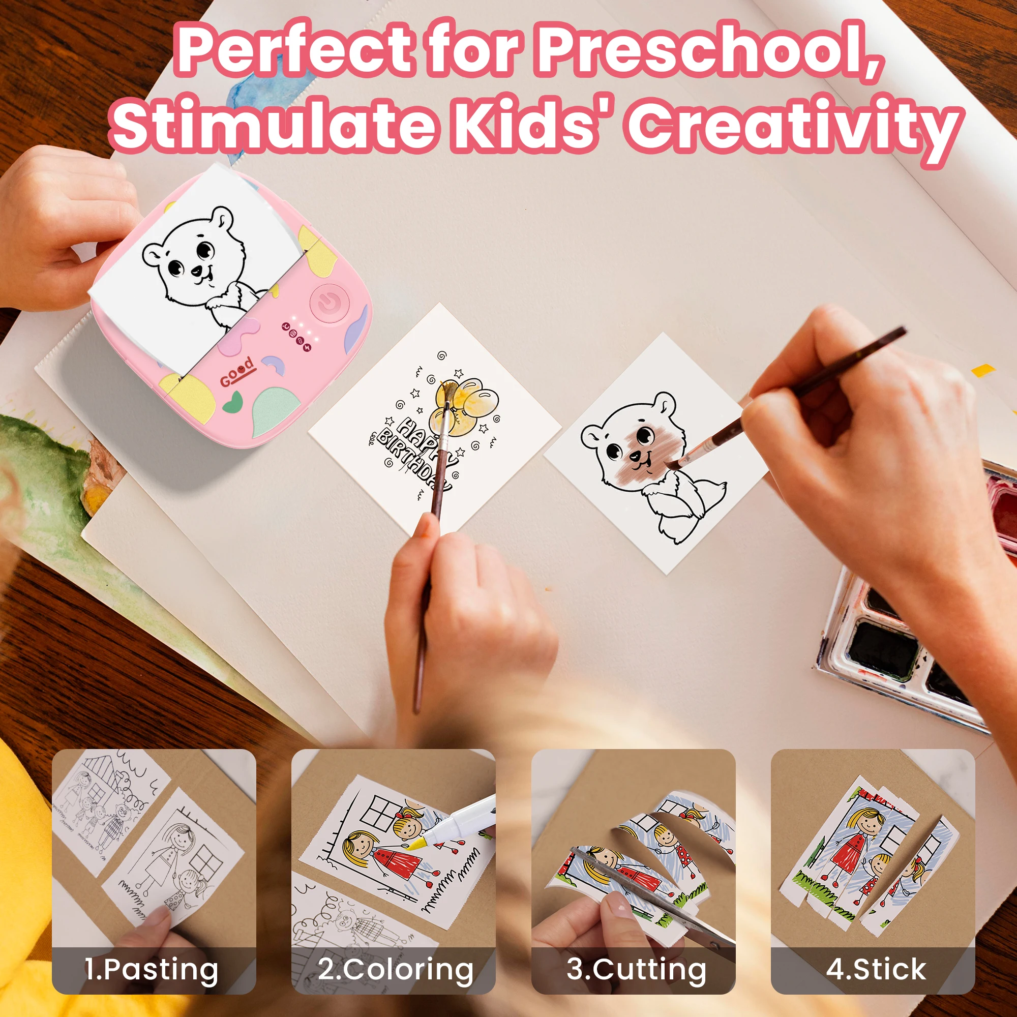 【No Ink, No Mess – Just Clear Prints】Powered by advanced thermal printing technology, this mini printer delivers crisp, high-resolution (203 DPI) black-and-white prints — no ink, no hassle, and no preheating needed. Prints smoothly on both self-adhesive sticker paper and regular thermal paper, including colorful rolls! Comes preloaded with 1 roll of white sticker paper, plus 3 bonus rolls for extra fun